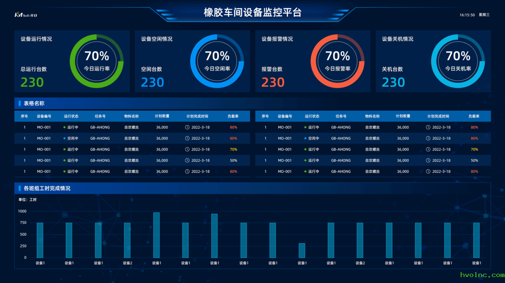 特别是橡胶工段设备监控系统,部署在橡胶工段入口大屏上,可监控车间所有生产设备运行情况,清晰地查看到硫化当前运行状态,硫化时间,压力,温度等参数,烘箱可查看到温度曲线,炼胶机运行辊距,温湿度传感器的车间当前温度和湿度等信息,实现了车间的透明化管理,为领导决策提供有力依据。