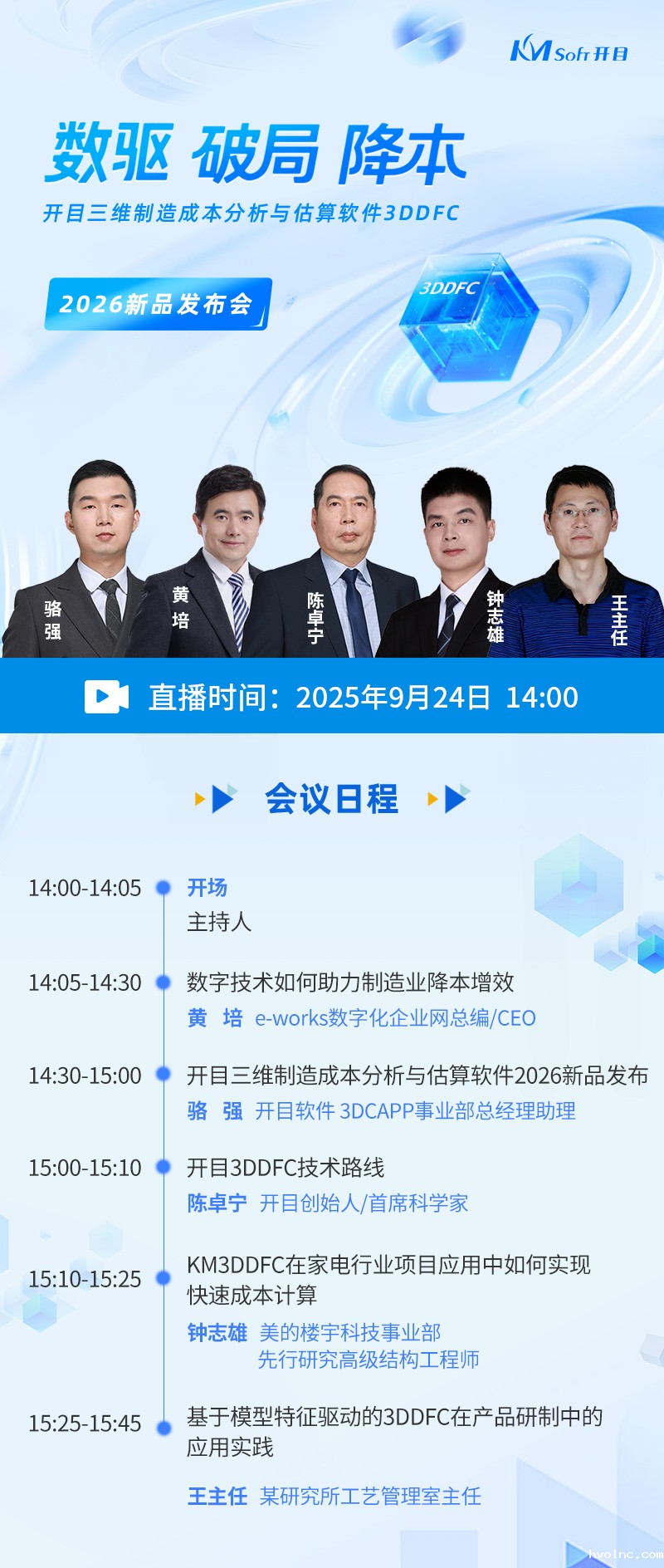为深度解读3DDFC 2026的技术突破与行业实践,分享智能制造时代的产品成本优化策略,betway官网软件定于2025年9月24日(周三)14:00举办“数驱 破局 降本·betway官网三维制造成本分析与估算软件3DDFC 2026新品发布会”,特邀您云端参会!