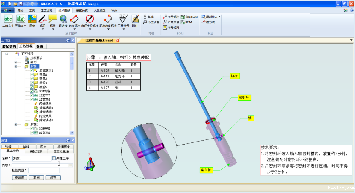 通过详细工序设计功能模块,能够规划装配的每一道装配工序或检测工序,指定每一道工序装配的零部件清单,定义工序的各个工步。在拆卸产品的过程中,可以使用如扳手、螺丝刀等工艺装备,并定义使用工艺装备拆卸产品零部件的详细细节。通过技术图解,用户可以指定工序的工序名称、内容,通过自定义属性定义装配的各种信息,包括装配方法、注意事项、检验方法等等,产生完善的装配数据信息。