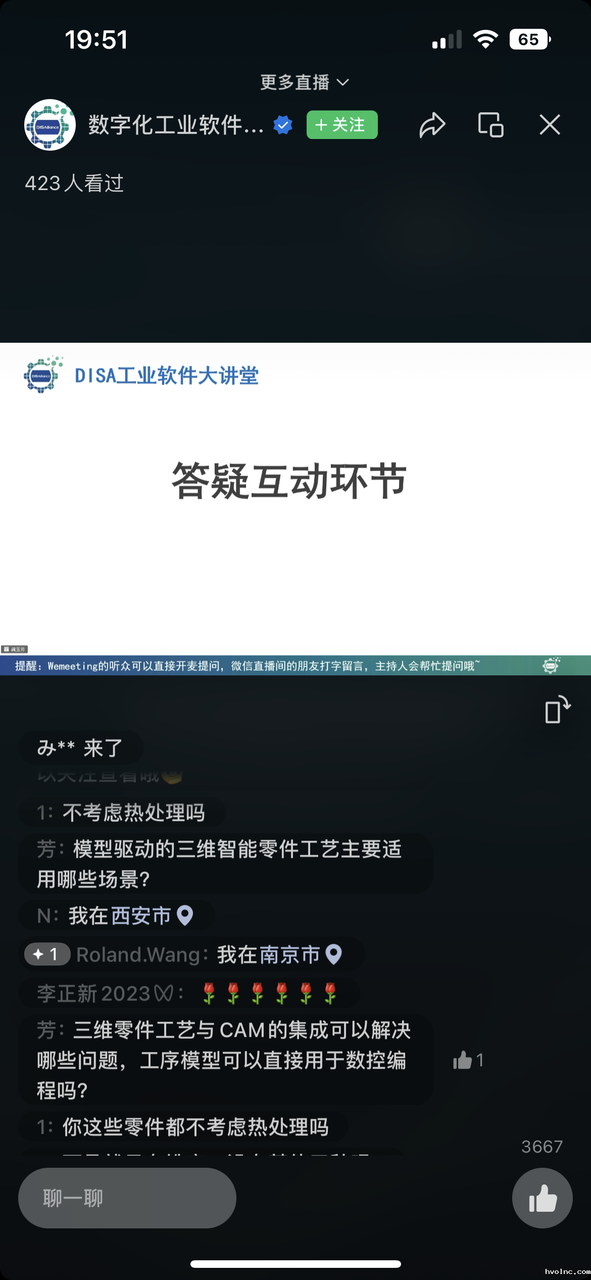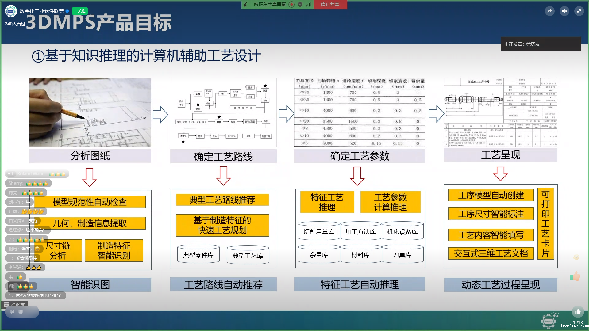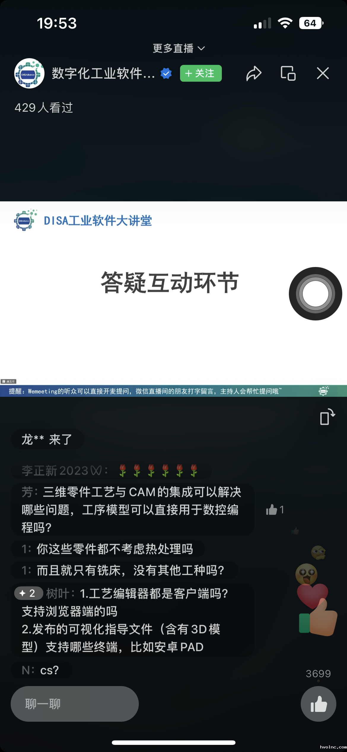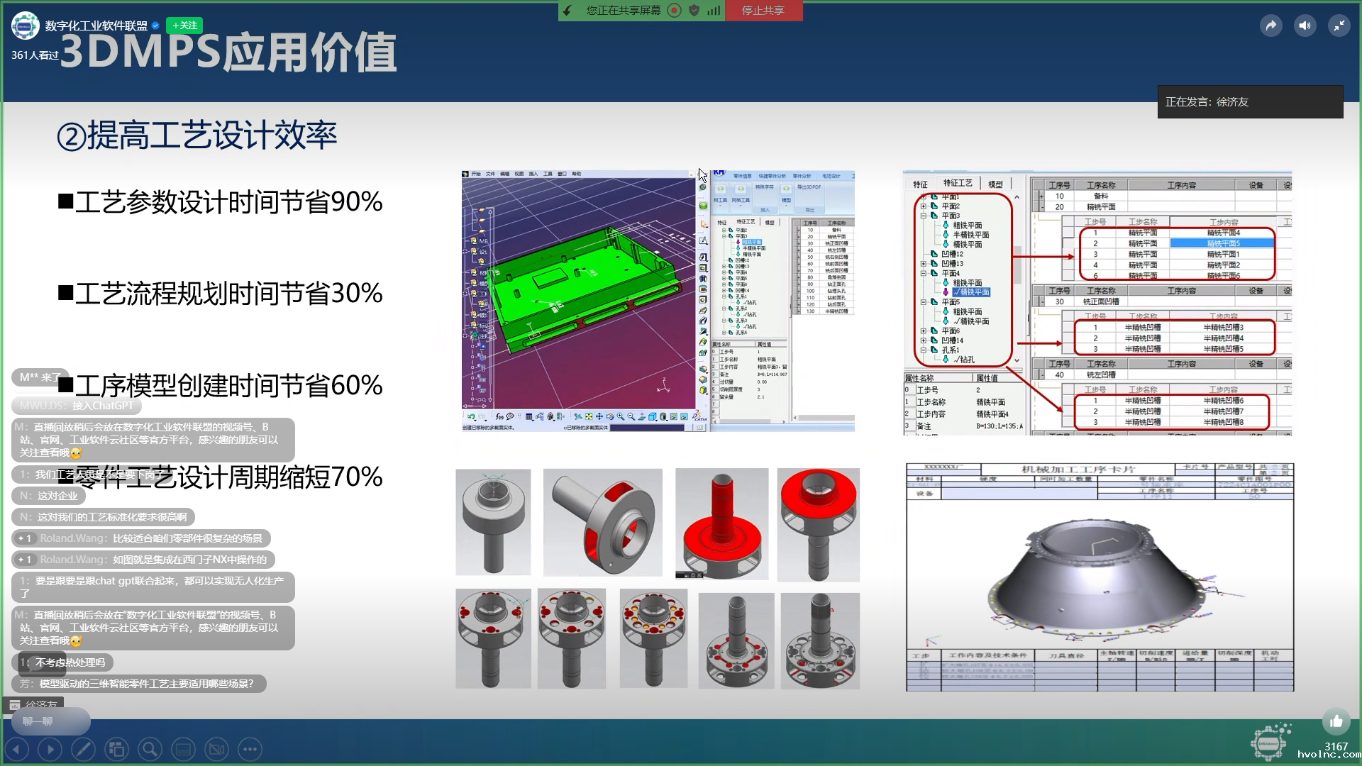 在答疑互动环节,参会嘉宾踊跃互动,就模型驱动的三维智能零件工艺适用场景、三维零件工艺与CAM的集成解决方案、3DMPS产品的输出可支持端口等相关话题与徐总进行深入探讨,徐总一一给以专业、细致的释疑解惑,让线上观众更深入了解3DMPS产品价值和应用效果,为制造企业数字化工艺创新提供参考借鉴,获得参会嘉宾的一致好评。
