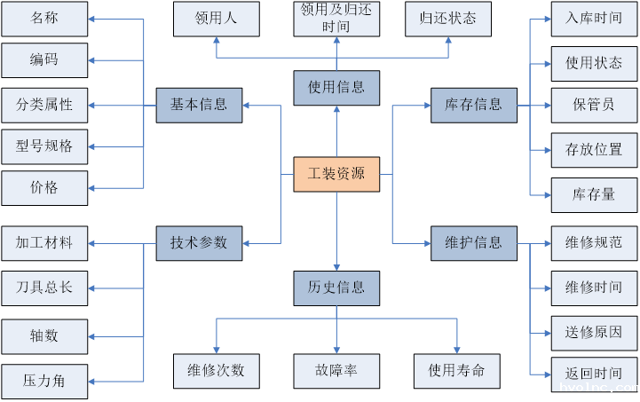 其中,为工装对象建立工装分类属性集是核心要素,包括定义各工装、工具对象的属性。可建立工装、工具对象动态目录,实现基于多厂所协同平台建立企业工装、工具库、组合夹具库,实现工装、工具库的共享,具备工装、工具、组合夹具资源的查询借用及共享管理。以实现不同业务部门、不同业务需求和不同岗位用户的工装使用需求。可清晰记录工装对象与产品/零部件、工艺、车间、操作人员等的关联关系,并通过自定义关联视图的方式直观地表达与工装、工具相关的其它信息的管理。系统提供关联管理,能够建立数据之间的逻辑关联,把与工装相关的其它信息(例如工艺文件、设备、人员、产品等)统一管理起来,便于用户进行工装相关信息的查询和追溯。