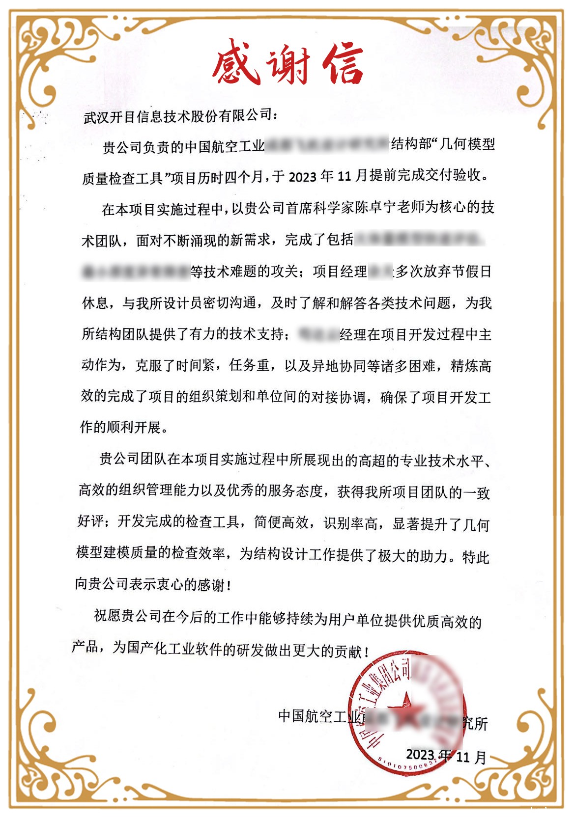 该研究所在感谢信中提到:“以贵公司首席科学家陈卓宁老师为核心的技术团队,面对不断涌现的新需求,完成了大量技术难题的攻关......贵公司团队在本项目实施过程中所展现出的高超的专业技术水平、高效的组织管理能力以及优秀的服务态度,获得我所项目团队的一致好评。目前的检查工具,简单高效,识别率高,显著提升了几何模型建模质量的检查效率,为结构设计的工作提供了极大的助力!”