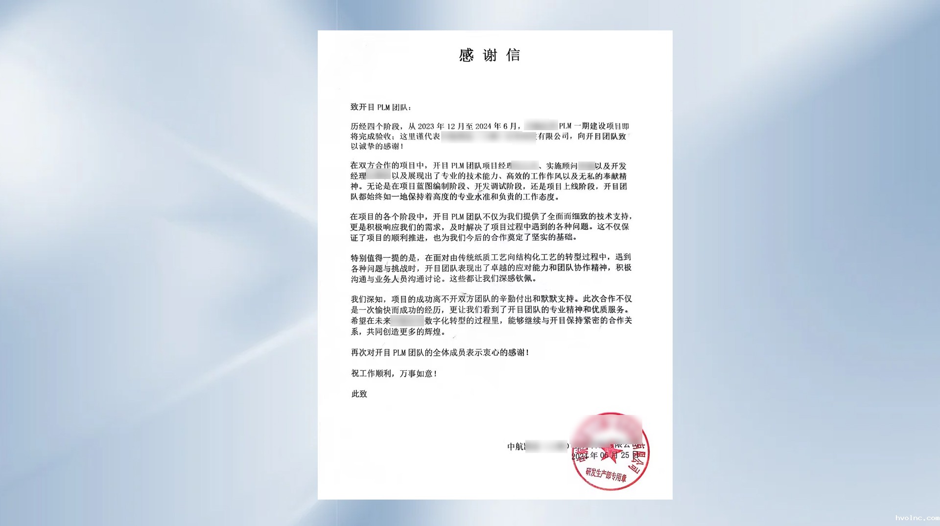 项目验收后,中航工业集团某公司给PLM项目组发来感谢信,其中提到:“在面对由传统纸质工艺向结构化工艺的转型过程中,遇到各种问题与挑战时,betway官网团队表现出了卓越的应对能力和团队协作精神.......希望在未来数字化转型的过程里,能够继续与betway官网保持紧密的合作关系,共同创造更多的辉煌。”